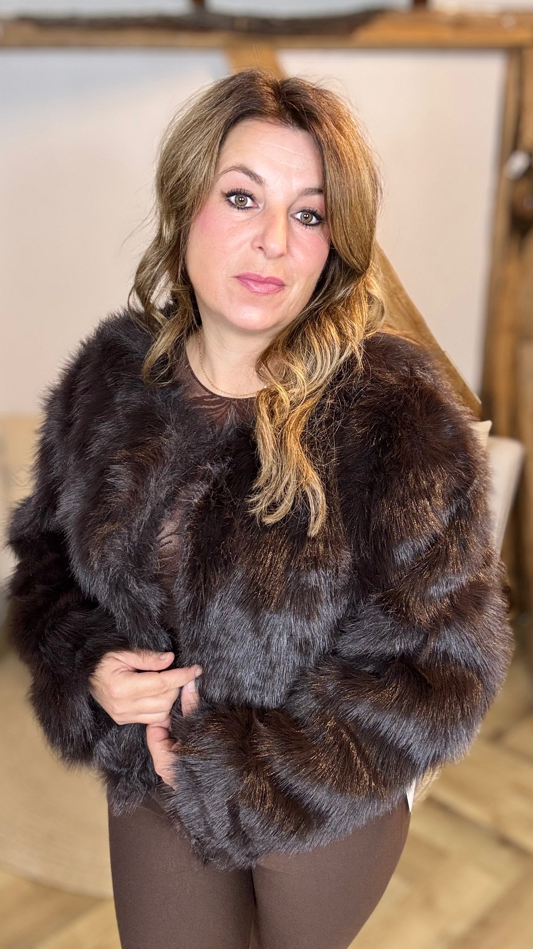 Upgrade je kledingkast met een trendy en diervriendelijke twist dankzij onze luxe nep bont jas in een warme, rijke bruine tint. Deze jas is de perfecte mix van fashion en functionaliteit, en houdt je stijlvol warm tijdens de koude maanden.
